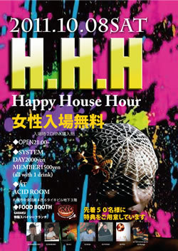 今月のH.H.Hです またもや今月も女性入場無料 待ちに待った10月のDJ ISHIKAWA を堪能しましょうね〜ん。 10/08(sat) 『H.H.H - Happy House Hour-』 ◆DJ◆ SHIMAYA SHO ISHIKAWA 4LA MOJA TOUMA YUA ◆After Hour DJ (am4:30〜)◆ Hirotsugu a.k.a WAKA OPEN 21:00 女性入場無料! ※入場時2drink購入して頂きます MEMBER \1500(with 1drink) DAY \2000(with 1drink) HOUSEミュージックで週末にHAPPYな時間を提供します。 実力派のHHH DJ陣がクオリティーの高いハウ