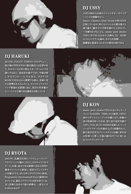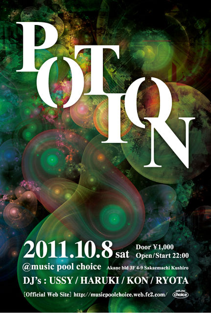 2011.10.08(sat) 【POTION】 @music pool choice 3F akane-BLD 4-9 sakaemachi kushiro open 22:00 dr 1,000 DJ,s Haruki Ryota Kon Ussy Design Toshi(Design Appli)