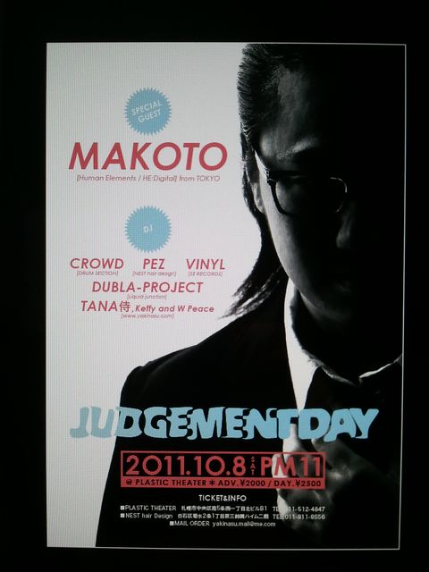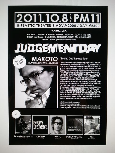 管理人様、 告知、失礼致します。 MAKOTO "Souled Out" Release Tour 2011 10/08(SAT) JUDGEMENTDAY@PLASTIC THEATER SAPPORO "2011/10/08 (SAT) JUDGEMENT DAY PV" "JUDGEMENT DAY" 2011 10/08 (SAT) 11PM @PLASTIC THEATER SAPPORO SPECIAL GUEST MAKOTO (HUMAN ELEMENTS / HE:Digital) Drum&Bassのミュージカル・サイドを代表するレーベルLTJ BukemのGood Looking Recordsの専属アーティストとして98年にデビュー以来、ソウル、ジャズ感覚溢れる感動的な楽曲を次々に生み出し、これまでに、2枚のアーティストアルバム『