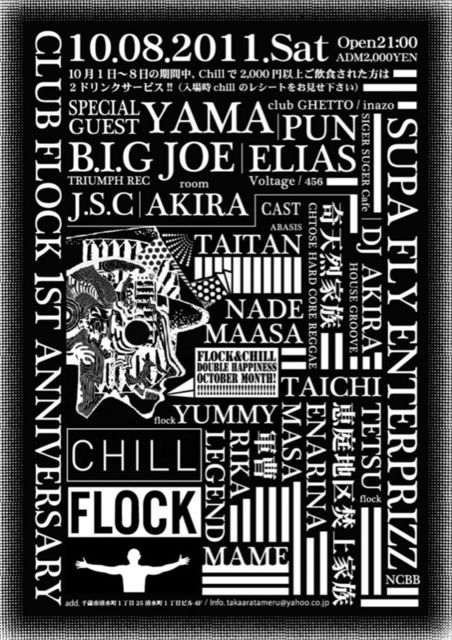 管理人様告知失礼いたします。 明日は千歳がお祭りです 北海道中からARTISTが集まってます!! 大集合宜しくお願いいたします!! 2011.10.08(SAT) @club flock (千歳市清水町1丁目25清水町1丁目ビル4F) 1st Anniversary open 21:00 ADV:2000 10.1〜10.8 chill でご飲食された方2ドリンクサービス (入場時chill のレシートをお見せ下さい) SPECIAL CAST YAMA(club GHETTO,inazo) B.I.G JOE(TRIUMPH REC) SUPA FLY ENTERPRIZZ(NCBB) ELIAS(Voltage/456) PUN(SIGER SUGER Cafe) J.S.C AKIRA(room)