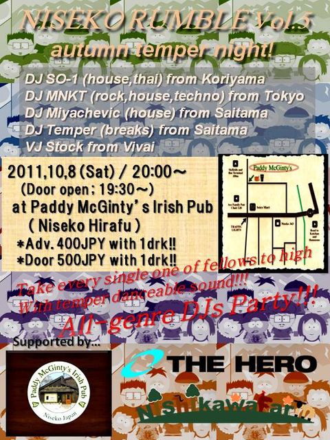 いやぁご無沙汰しております。オーガナイザーもいつか復活を…期待してましたが。。。 復活です!あのアホウなDJパーティが帰ってまいりました!! しかも立ち上げフルメンバーでの復活…モニターがにじんで見えないww ・・・・・・・・・・・・・・・・・・・・・・・・・・・・・・・・・・・・・・・・・・・・・・・・・・・・・・・・・・・・・・・・ 【NISEKO RUMBLE Vol.5 autumn temper night! 】 house, techno, Breaks, digirock, etc!!!!! 場所:パディマクギンティーズ・アイリッシュパブ 〜北海道虻