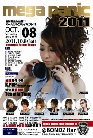 mega panicよりお知らせです さらに飲み放題料金がお安くなりました!!! この機会に是非御来場ください☆ -------------------- 【mega panic 2011】 「クラヴァーが熱狂する1年を締めくくるフィナーレシーズン[秋]の第2幕 !!」 mega panic Autumn Season !! -Next Season ?- 札幌21世紀初の 無制限飲み放題!! 週末オールジャンル!! オンリーワン !! レギュラーイベント!! スタッフ一同、総力を挙げて「すすきの最新空間@BONDZ Bar」にて開催 !! ■日時 (Date)