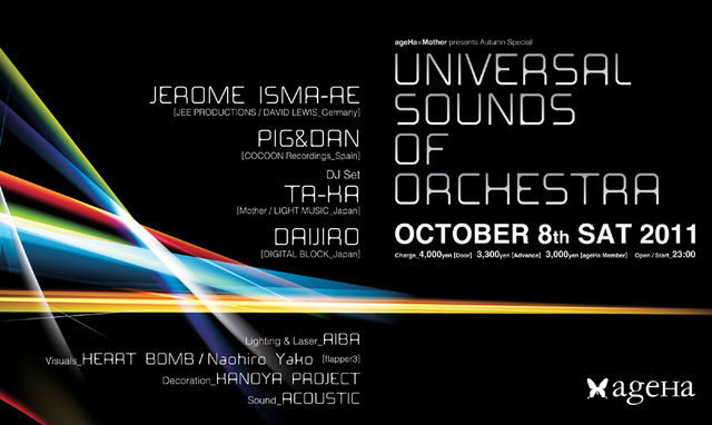 6月以来、約3か月ぶりとなるageHa×Mother 今回は、秋の夜長を彩る“AUTUMN SPECIAL” 「UNIVERSAL SOUNDS OF ORCHESTRA」 開催! 秋のスペシャルパーティでは、約1年半ぶりにDJ TA-KAの出演が決定。 S.O.S 2008以来の登場となるスペインの人気デュオ・PIG&DANと、 2010年の来日でその名を轟かせたJEROME ISMA-AEが再来日を果たします。 さらにWATERでは実力派オーガナイズチーム、 PRIMITIVE×RAFTの強力コラボレーションが実現! BOXでは2月の公演で会場を埋め尽くし大熱狂の渦に巻き込んだ 電撃ネットワークをスペシャルゲストに