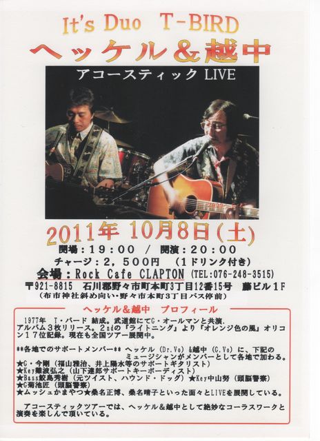 10月8日(土) PM7:00オープン PM:8:00スタート It’s Duo T−BIRD 『 ヘッケル & 越中 』 アコースティックライブ ミュージックチャージ 2,500円(ワンドリンク付)