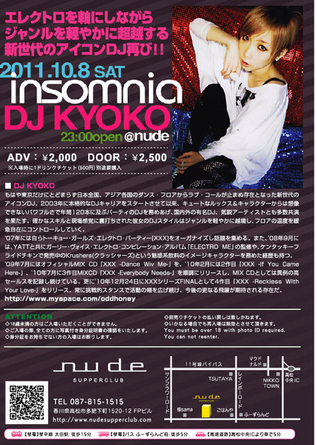 DJ KYOKO¡Ú10/8¡Û¤ÎÆü¤â¡¢Massattack¡Ú10/9¡Û¤ÎÆü¤â¥³¥ß¥å¥Ë¥Æ¥£»²²ÃÆÃŵͤê¤Ç¤¹¤è ¡Ú¤³¤³¤Ë¢ http://mixi.jp/view_community.pl?id=895420 ¡Û Æþ¾ì»þ¤Ë¼õÉդǡڥ̡¼¥É¥µ¥Ñ¡¼¥¯¥é¥Ö¡Û¥³¥ß¥å¥Ë¥Æ¥£»²²Ã²èÌÌÄ󼨤Ǥ⤦£±£ä£ô¥µ¡¼¥Ó¥¹Æþ¾ì»þ¤Ë·×£²Ëç¤Ç¤¹¤è ³Ú¤·¤¯¡õ¤ªÆÀ¤ËÍ·¤Ó¤Þ¤·¤ç¤¦ ¢££±£°·î£¸Æü(ÅÚ)¡¡£é£î£ó£ï£í£î£é£á -DJ KYOKO @ nude- ¢ö¡§HOUSE GUEST¡§DJ KYOKO GUEST DANCER¡§ROBIN(Ä»ÐÔKYOTO) DJ¡§KAMANO / AKKYAN / Saimagstar / MARO TIME¡§23:00open PRICE¡§Adv2,000yen / Door2,500