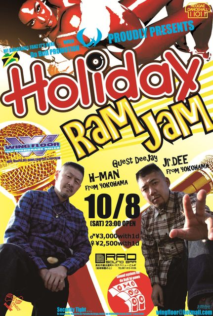 ¡ØHOLIDAY RAM JAM¡Ù 2011ǯ10·î8Æü(ÅÚ) 23¡§00OPEN ¡ÚALL NIGHT¡Û ¡÷RAD¡Ê¹â¾¾»ÔÃÃÌê²°Ä®4-15¥¢¥Ù¥Ë¥å¡¼¥Ó¥ë4F¡¡TEL087-813-0105) ¡é\3,000with1d ¡ê\2,500with1d ¢£Guest artist/H-MAN¡¢Jr.Dee¡Êfrom YOKOHAMA¡Ë ¢£Host Sound/WINGFLOOR¡¡¡õmore ¢£Sound system by da Bull hi pawa ¢£More info:wingfloor@hotmail.com 10·î¤ÎWF¥ì¥®¥å¥é¡¼¥À¥ó¥¹¤Ï¡¢µ×¡¹¤ÎÍè¹â¡ª ¥Ï¥Þ¤Î¥Ù¥Æ¥é¥óDJ¡¢H-MAN¡¢JR DEE¤ò·Þ¤¨¤Æ 2¿Í¤Î¿·¥¢¥ë¥Ð¥à¡Ø DOUBLE TROUBLE¡Ù¤Î¥ê¥ê¡¼¥¹¥Ä¥¢¡¼in¹â¾¾¤ò¹Ô¤¤¤Þ¤¹¡£ ¤¤¤Ö¤·¶äDJ2¿Í