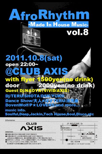 Afro Rhythm Vol.£¸ - made in house music- ¢£2011.10.8(SAT) open 22:00~till morning ¢£´Ýµµ»Ô¡÷CLUB AXIS ¢£Adv 1,500yen¡Êno drink) ¢£Door 2,000yen(no drink) ¢¨¼õÉÕ¤Ç1drink(500yen)¹ØÆþ¤·¤Æ¤¤¤¿¤À¤¤Þ¤¹ ¢£Guest Dj/NAOYA(ViViD/AXIS) ¢£DJz/ TERU/SHOTA/DSK/YUKO ¢£DANCE SHOW/Âç¿Í¥á¤Ñ¤¹TERU/ÒÄ·»Äï/DovenWolf/P¡úLOVERS/and more... MUSIC INFO. SOULFUL HOUSE/DEEP HOUSE/JACKIN HOUSE/ TECH HOUSE/SOUL/FUNK/DISCO/R&B/etc. STAFF/ KANA/HIME/ISHIKO/MEG/OMU/TERRY/MIMU/RAY SPECIAL THANK