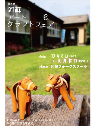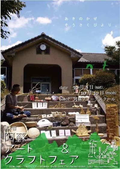 木工・陶芸・竹細工・革工芸・服・銀・ガラス・・・・など、 作家さん、お一人お一人の熱意と巧みな手仕事から生まれた作品の数々。 使い手と作り手との交流のひとときを、 ここ阿蘇フォークスクールでゆっくりとお過ごしください。 今年の出店作家さんの数は125ブースです。 また、地元の農産物や婦人部が作る美味しい食事もあります。 <開催日時> 10月8日 午前10時〜午後5時 9日 午前10時〜午後5時 10日 午前10時〜午後4時 【問い合わせ】 NPO法人阿蘇フォークスクール 〒869-1601 熊本県阿蘇郡高森町上色