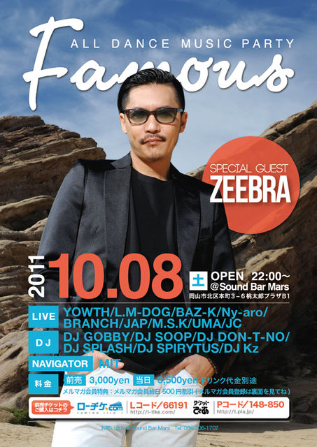 フューチャリングに “ AI ” を迎えた平和祈願ソング『BLUE』 を7月にリリースしたばかりでのCLUBツアーです。史上最大スケールで描く平和祈念ソング!!彼自身…東日本震災後に様々な気持ちを込め制作に取り掛かった『BLUE』や今までのクラッシックを引っ提げZEEBRA名義としては約5年ぶりの岡山です。