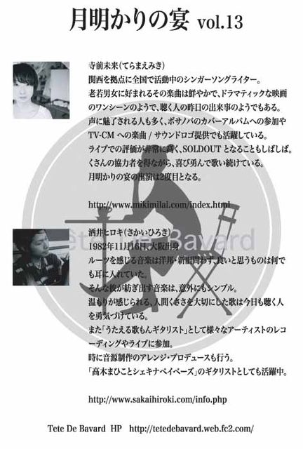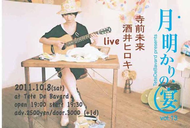 月明かりの宴 vol.13 寺前未来・酒井ヒロキ live 2011.10.8 (sat) open 19:00 / start 19:30 adv.2500yen / door.3000yen (+1drink) 10月の月明かりの宴は前回大好評だった、寺前未来さんに決定しました。 前回も言いましたが、papaイチオシのアーティストです!まちがいなし!! そしてそして、今回はミュージシャンの 酒井ヒロキと共演です。 なんと贅沢な!! これは絶対に見逃せませんよ! ご予約はお早めに。 live 終了後、真夜中の晩餐を行います。 ナオユキさん達と一緒に打ち上げしませんか! 参加費:2000yen(+1d