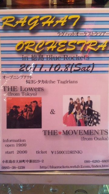 ´ÉÍý¿ÍÍÍ¡¢¼ºÎ餷¤Þ¤¹¡ª ¥é¥°¥Ï¥Ã¥È¥ª¡¼¥±¥¹¥È¥é¥Ä¥¢¡¼ inÆÁÅçBlue Rocket's 2011.10.8(Sat) THE Lowers(from Tokyo) THE¡ùMOVEMENTS(from Osaka) ޵ްŽÌŽßŽÆŽÝޏŽÞޱޏŽÄ>>ǺŽÖ޼ŽÀ޶&the Tagirians ticket \1500(1DRINK) Open:19:00 Start:20:00 music&dining bar Blue Rocket's¤ÎÏ¢ÍíÀè¤Ï¢ 0885-38-1238 090-6283-6807 ¤è¤í¤·¤¯¤ª´ê¤¤¤·¤Þ¤¹(^O^)¡ª