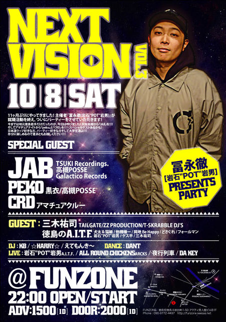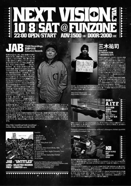 ¹ðÃμºÎ餷¤Þ¤¹¡ª JAB¤µ¤ó½Ð±é¤·¤Þ¤¹¡ª ¤è¤«¤Ã¤¿¤é¥á¥Ã¥»¡¼¥¸¤è¤í¤·¤¯¤ª´ê¤¤¤·¤Þ¤¹¡ª ¡ÁÉÚ±ÊŰ(´äÀÐ"POT"´äÃË)Presents¡Á NEXT VISION vol.3 £±£°·î£¸Æü(ÅÚ)£²£²»þstart @FUNZONE http://funzone.seesaa.net ÆÁÅ縩ÆÁÅç»Ô½©ÅÄÄ®1-50¥¢¥¯¥Æ¥£°Û¿Í´Û¥Ó¥ëB1F Á°Çä¤ê/1500±ß(1D) ÅöÆü /2000±ß(1D) ¢£Special Guest¢£ JAB(TSUKI Recording/¹âÄÐPOSSE/Galactico Records) peko(¹õ°á/¹âÄÐPOSSE) CRD(¥¢¥Þ¥Á¥å¥¢¥¯¥ë¡¼) ¢£Guest¢£ »°ÌÚÍ´»Ê(TAILGATE/ZZ PRODUCTION/T-SKRABBLE DJ'S) ÆÁÅç¤ÎA.I.T.F. ¢£DJ¢£ KB HARRY ¤¨
