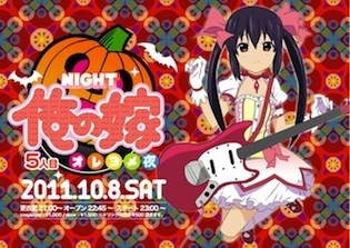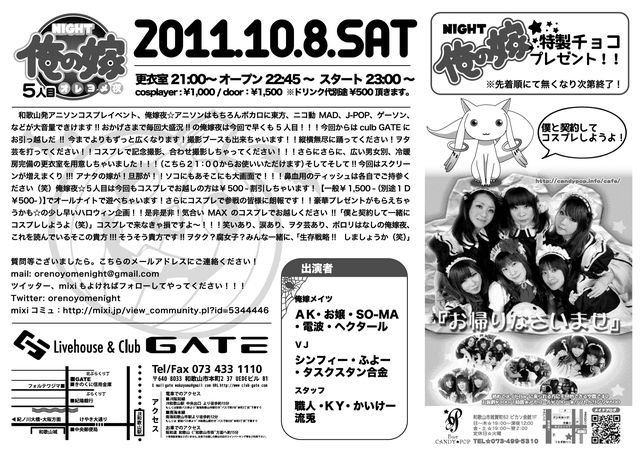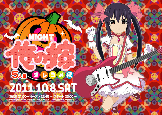 いつもお世話になっております。 イベント告知失礼致します。 不適切な場合はお手数おかけしますが、削除お願いします。 次回!!10月8日土曜日!!5人目ケテーイ!!!!!!!"( ` ▽ ´ )" うひょ タイトル:俺の嫁NIGHT 5人目 ジャンル:アニソン/VOCALOID/東方アレンジ/ニコ動 MAD/J-POP CAST: ・俺嫁メイツ AK お嬢 SO-MA 電波 ヘクタール ・VJ シンフィー ふよー タスクスタン合金 ・スタッフ 職人 KY かいけー 流兎 OPEN/START 22:45/23:00 (更衣室は21:00から開いてます) チケット代