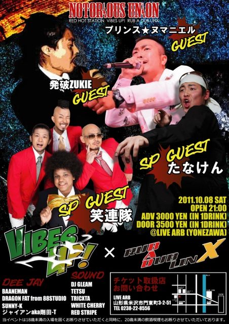 VIBES UP!×RUB A DUB LINX 10月8日米沢に爆笑が起こる! 米沢VIBES UP!と山形RUB A DUB LINXとのコラボレーションでスペシャルです! Special guestにROAD TO レゲエ祭2011 決勝進出、レゲエ界が生んでしまった最低で最高のオバカルテット笑連隊! そしてもう一人!ROAD TO レゲエ祭2009チャンピオン、粋でいなせなファンタジスタ系技巧派レゲエ・ディージェイ。たなけん! GUESTにROAD TO レゲエ祭2009出場、栃木の産業廃棄物またの名をアウトオブレゲエ“プリンス★ヌマニエル!”板橋のダミアン“発破ZUKIE! 爆笑間違いなし! VIBES UP!×RUB