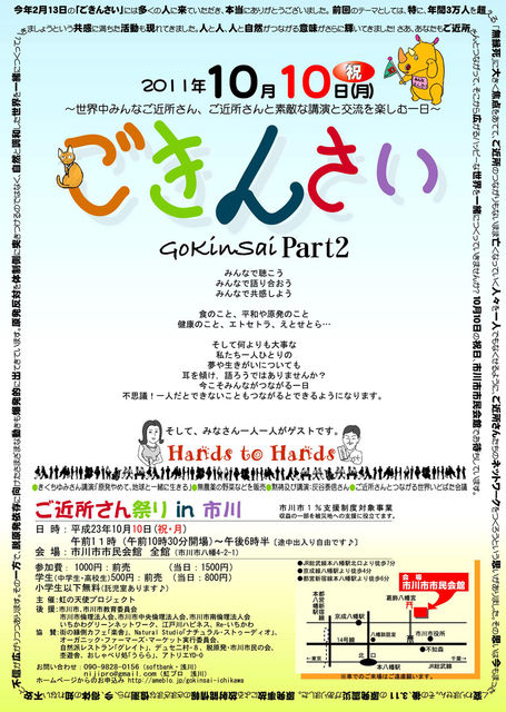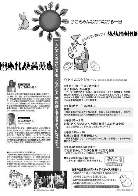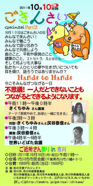 88年から20年間以上、脱原発の活動をされてきた きくちゆみさんの講演会やトークショー、 みんなでつながるワールドカフェもある一大イベントです!! ★ご近所さん祭りin市川★ http://ameblo.jp/gokinsai-ichikawa/ ◇日時:2011年10月10日(月・祝日) 午前11時〜 (午前10時30分開場)※途中出入り自由です♪ ◇会場:市川市市民会館全館貸切! 千葉県市川市八幡4-2-1 ・JR総武線本八幡駅北口より徒歩7分 ・京成線八幡駅より徒歩4分 ・都営新宿線本八幡駅より徒歩6分 ◇参加費:1000円(前売及び予約) 1500円(