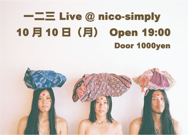 2011年10月10日(月、祝) 一二三 Live @ nico-simply Open 19:00 Start 20:30ごろ Door 1000yen 長野県中野市吉田900-1 ☆信州中野I.Cから車で5分 問い合わせ 0269-23-5333 http://www.nico-simply.com 詳しくは ☟ http://blog.livedoor.jp/nico_simply/archives/51788240.html