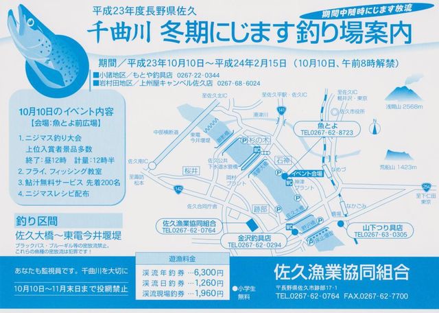 10月10日(月)より 千曲川冬期ニジマス釣り場がオープンします。 詳しくは佐久漁協ホームページまで。