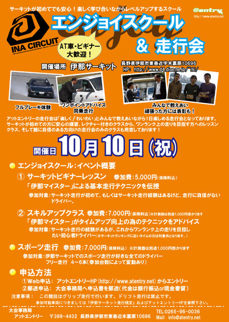 アットエントリーの走行会は「楽しく」「わいわい」とみんなで教えあいながら1日楽しめる走行会となっております。サーキットが初めての方に安心の講習、レクチャー付きのクラスから、ワンランク上の走りを目指す方へのレッスンクラス、そして腕に自信のある方向けの走行会のみのスポーツ走行クラスも用意。 ■ビギナーレッスン 参加対象: サーキット走行が初めて、もしくはサーキット走行がまだまだ「おっかないな・・・」と、自信がないかた。 レッスン内容: 座学講習、先導付走行、ワンポイントレッスン、フリー走行 ■スキルアップク