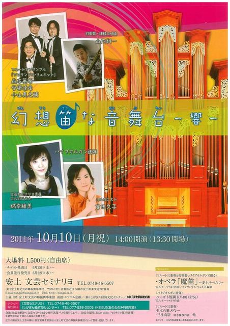 幻想笛な音舞台〜響〜 異色の共演によるスペシャルステージ!! プログラム:オペラ「魔笛」〜安土バージョン〜、フーガ ト短調 KV401(375e) 他 日 時 : 2011年10月10日(月祝) 14:00開演 (13:30開場) 入 場 料 : 1500円 〈自由席〉 出 演 :(フルートアンサンブル)アンサンブル・リュネット (打楽器・津軽三味線)山内利一 (パイプオルガン連弾)城奈緒美&吉田久子
