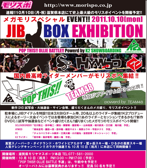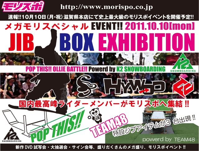 メガ盛り!!スペシャルモリスポイベント開催決定!! 10月10日(祝月)in守山本店 2011年10月10日(祝月)滋賀県モリヤマスポーツ本店にて史上最大級のモリスポイベントが開催されます!! 「メガモリスペシャルイベント!!ジブボックスエキシビジョン!! POPTHIS オーリーバトル!!」 なんとっ!!国内最高峰のライダーが滋賀モリスポ守山本店に集結!!!!! SCLOVER3RIDER・HYWOD・FC・そしてK2チームのメンバーがあなたの目の前でスーパースキルを見せつけてくれますっ!! SCLOVER3「石川敦士・田中暢二・関功・関智晴・壁田竜一・山本拓実・相川
