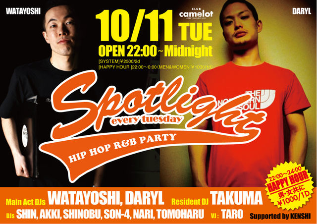 告知失礼します。 10/11 (火) 22:00-5:00 -HipHop, R&B Party- 『SPOTLIGHT』 @Camelot 火曜camelotの大人気PARTY『Spotlight』 毎回400人規模で盛り上がっているこのParty!!!!! 第二火曜日のこの日はSpotlight@Camelotがどこよりも間違いないHipHop Partyをお届けします!!!! 是非遊びに来てみてください☆ ---------------------------------------------- ★ゲストお取りします★ 通常料金2500/2dのところを 連絡頂ければ格安のゲスト料金 男性 1000円/1Drink 女性 1000円/2Drinks にてご入場頂