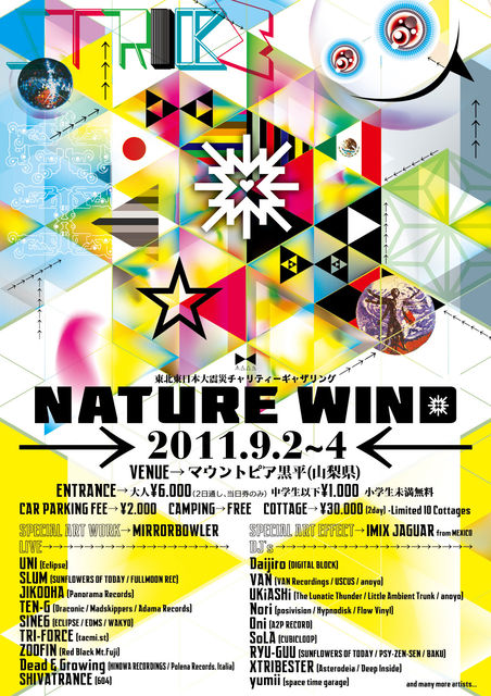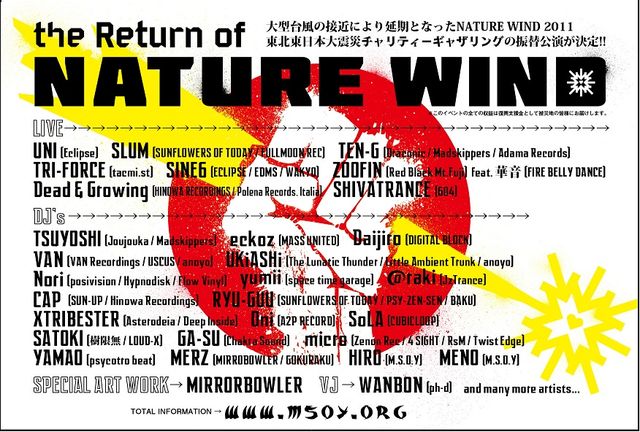 大型台風の接近により、残念ながら延期となったNATURE WIND 2011 東北東日本大震災チャリティーギャザリングの振り替え公演が決定!! 延期になったことでTEN-Gの兄貴分、DJ TSUYOSHIの出演が決定しました NATURE WIND 2011 東北東日本大震災チャリティーギャザリング OCTOBER,14th(FRI)〜16th(SUN)2011 ※このイベントの全ての収益は復興支援金として被災地の皆様にお届けします。 TOTAL INFORMATION→http://msoy.org VENUE→→→→ マウントピア黒平(山梨県) GATE OPEN→12:00PM-2nd(FRI) MUSIC STAR