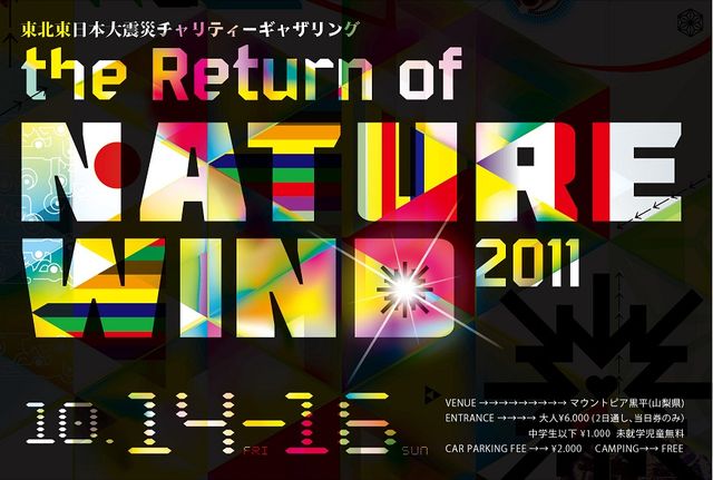 大型台風の接近により、残念ながら延期となったNATURE WIND 2011 東北東日本大震災チャリティーギャザリングの振り替え公演が決定!! 被災者の皆さんも復興に向かって前進し続けています。 だから僕たちも諦めません!! みんなの力と心をひとつに、みんなでやればきっと何かができる。 NATURE WIND 2011 東北東日本大震災チャリティーギャザリング OCTOBER,14th(FRI)〜16th(SUN)2011 ※このイベントの全ての収益は復興支援金として被災地の皆様にお届けします。 TOTAL INFORMATION→www. msoy.org VENUE→→→→ マウントピア