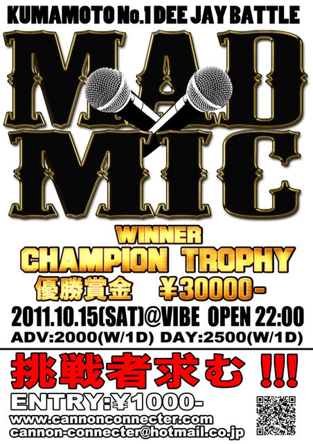 MAD MIC 2011 2011.10.15(SAT) @VIBE OPEN/START 22:00〜 ADV/2000 W1D DAY/2500 W1D 優勝賞金 ¥30000 MAD MIC CHAMPION TROPHY HOST CANNON CONNECTER 現在ENTRYしてるDEEJAY! MOSBOURNE (MAD MIC 2010 CHAMPION) KUWA 24PONG TAHARA-T ACE MARK JELLY FISH GUN-J です!! 我こそはと思うDEEJAY 挑戦待ってます!!