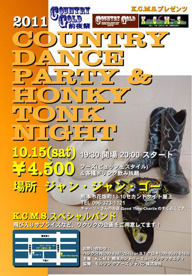 CG前夜をカントリーダンスと生バンド演奏でお楽しみ下さい。 ----------------------------------------------------- ■日 時:10月15日(土曜日) ■時 間:開 場⇒PM 7:00 開 演⇒PM 7:30〜 ----------------------------------------------------- 会場:栄通り 『SECOND SITE』 屋上特設会場 熊本市花畑町13-15(中華レストラン:ジャン・ジャン・ゴーRF) http://countrygold.net/kcms/zenyasai2011.html