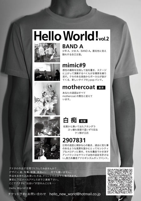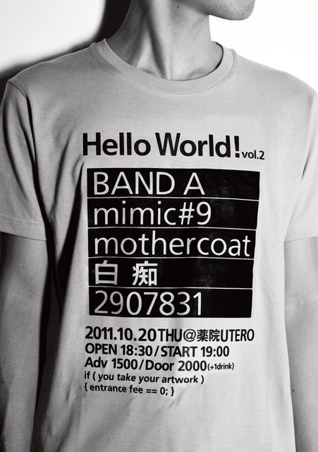 Hello World! vol.2 10·î20Æü(ÌÚ)¡¡¡¡at Ìô±¡UTERO open 18:30/ start 19:00 adv 1500±ß/day 2000±ß +1drink cast:¡¡ BAND A mimic#9 mothercoat(Åìµþ) ÇòÃÔ(º´²ì) 2907831 ¢¨special discount ¤¢¤Ê¤¿¤ÎºîÉʤǶõ´Ö¤Å¤¯¤ê¤·¤Þ¤»¤ó¤«¡©ºîÉÊ(¥Ç¥¶¥¤¥ó¡¢³¨¡¢¼Ì¿¿¡¢±ÇÁüetc¡Ä)¤ò»ý¤Ã¤Æ¤¤ÆÄº¤¤¤¿Êý¤Ï¥É¥ê¥ó¥¯Âå¤Î¤ß¤ÇÆþ¾ì¤Ç¤¤Þ¤¹¡£ ¡¡¡¡¤¿¤À¤·¡¢»öÁ°¤Ë hello_new_world@hotmail.co.jp ¤Þ¤Ç¤´Ï¢Íí²¼¤µ¤¤¡£