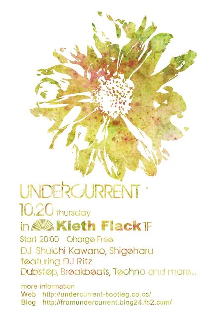 UNDERCURRENT 10/20(ÌÚÍË) KIETH FLACK 1F Open/20:00 Charge/FREE DJ/ Shuichi Kawano Shigeharu ¡¡¡¡¡¡+ featuring Ritz (ex-Utopia) Playing the DUBSTEP,BREAKBEATS,TECHNO and more... DJ Ritz Ê¡²¬¤òµòÅÀ¤Ë³èư¤¹¤ë½÷ÀDJ·ó¥ª¡¼¥¬¥Ê¥¤¥¶¡¼¡£ DEEPHOUSE¡ÁTECHNO¡ÁMINIMAL¤ò²£ÃǤ¹¤ëÉý¹¤¤Áª¶Ê¤È ¥ß¥Ã¥¯¥¹¤Î¥Æ¥¯¥Ë¥Ã¥¯¤ËÄêɾ¤¬¤¢¤ë¼ÂÎÏÇÉ¡£ ¤½¤·¤Æ¡ª 10·î¤Î¥¡¼¥¹¥Õ¥é¥Ã¥¯¡¢11·î¤Î¥á¥¬¥Ø¥ë¥Ä¡¡¶¦¤ËÀèÃå¤Ç Kawano,Shigeharu,Ritz,Iwao,Shiragami¤Î5¿Í¤ÇÁª¶Ê¤·¤¿¥ß¥Ã¥¯¥¹CD ¡ÈUNDERCURRENT MIX October