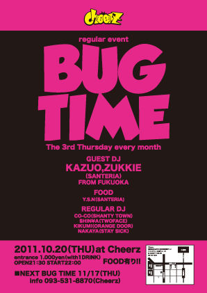 ·î¤Ë1Å٤Τª³Ú¤·¤ßCheerz¥ì¥®¥å¥é¡¼¥¤¥Ù¥ó¥ÈŽ¢BUG TIMEŽ£¡ª º£²ó¤ÎGUEST DJ¤ÏÊ¡²¬SANTERIA¤«¤éKAZUO&ZUKKIE¡ª¡ª¡ª ¹¹¤ËFOOD¤ÇY.S.N¡ª¡ª¡ª(¤Þ¤¿½Ð¤¿¡Á¤Ã¡ª¾Ð) ¹¹¤Ë¹¹¤ËKIKUMI¤Á¤ã¤ó¤¬REGULAR DJ¤È¤·¤ÆÉü³è¡ª¡ª¡ª ¡Ê¤¿¤Þ¤Ë½Ð¤ì¤ó»þ¤â¤¢¤ë¤«¤â¤·¤ì¤ó¤±¤É¡ª¡Ë º£·î¤â¥Ð¥°¤ê¤Ë¥Ð¥°¤Ã¤Æ¤¤¤¤Þ¤·¤ç¡¼¢ö ¡ÚCheerz Regular Event¡Û ¡ÖBUG TIME¡× ¢¨Ëè·îÂè3ÌÚÍËÆü 2011.10.20(THU) OPEN 21:30 / START 22:00 entrance 1.000yen(with 1DRINK) ¡ÚGUEST DJ¡Û KAZUO&ZUKKIE (from SANTERIA) Regular Djs CO-CO¡ÊSHANTY TOWN¡Ë