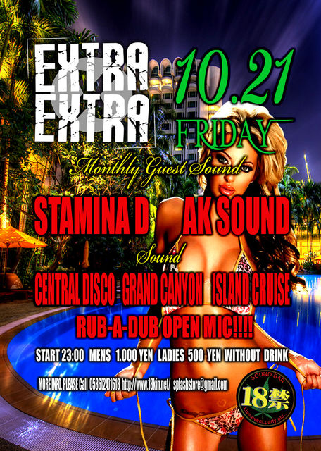 告知失礼します。 2011.10.21(金) 「EXTRA EXTRA」一宮@SOUND BAR18禁 Open / Start 23:00 Close(予定) 翌5:00 ◆MONTHLY GUEST SOUND  STAMINA D  AK SOUND  RUB-A-DUB OPEN MIC!!!!! ◆SOUND  CENTRAL DISCO / GRAND CANYON / ISLAND CRUSE MENS  \1000 LADIES \500 会場名:SOUND BAR 18禁      〒491-0859 愛知県一宮市本町4-9-21 UNO SETTE ビル2F  TEL:0586-24-1618