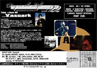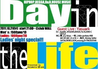 明日、club WALLにて、YasuarkがGUEST出演致します!! 10/21(fri) Prismatic Gem.Pro presents 『Day in the Life vol.22』@club WALL 〜Ladies' night special !!!!〜 Men's:\1500/1D Ladies:\1000/2D OPEN 21:00 [Guest Live] Yasuark [DJ] Apollo DM PUNK NOZAKI Yu-ki KIM-C TAYLA [MC] 櫟 sLy blue 408 MC KY MC ホルモン 無月 Honey bebe SATIA REBELLION wooog D-TRICKSTAR
