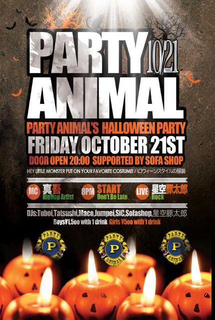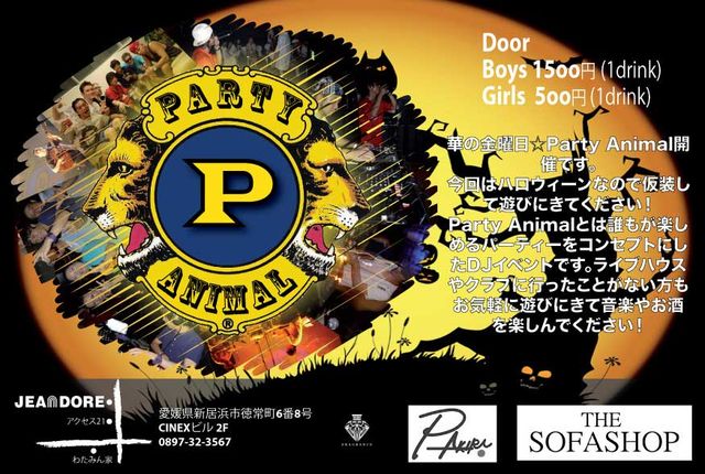 管理人様、告知失礼します。 -PARTY ANIMAL Vol.2- Halloween Party 10.21(Fri) Start 20:00 @JEANDORE Niihama Door:Boy1500yen(1drink付き) Girl500yen(1drink付き) DJs:Tuboi,Tatsushi,Maco,Jumpei,SiC,Sofashop MC:真吾 Live:星空豚太郎 Supported by SOFASHOP 今回のParty Animalはハロウィーン仕様です。 DJだけでなく、MCありバンドありの充実した内容になっていますので、 クラブやライブハウスに行ったことがない方もぜひお越しください☆