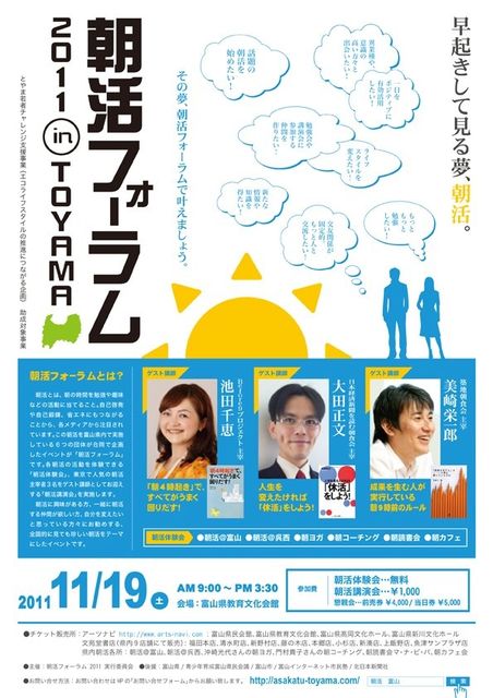 第52回 朝活のご案内です。 富山朝活を体験し、「コレを金沢でもやりたい!」と思い、 朝活@金沢が誕生しました。 その本家の富山で朝活フォーラムというイベントが行われます。 内容はいくつかの朝活体験ができ、3名の朝活関係の本を出版されている ゲスト講師を迎えての講演もあり。 今回はそこまでに至った経緯やゲスト講師の方のお話などを 朝活フォーラム実行委員会のメンバーからお話いただきます。 テーマ : 朝活フォーラム2011inTOYAMAについて語る 進 行 : 朝活フォーラム実行委員会の皆