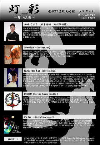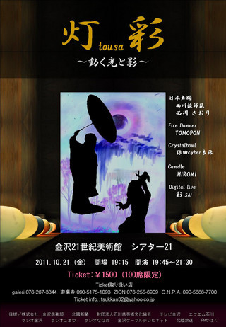 管理人様告知失礼致します。 【灯 彩】 〜動く光と影〜 2011・10・21(金) 金沢21世紀美術館 シアター21 開場 19:15 開演 19:45〜21:30 ticket 1500円 (100席限定) ☆GUEST☆ ・西川 さおり (日本舞踊 西川流師範) ・TOMOPON (Fire Dancer) ・依田 cyber 良治 (crystalbowl) ☆candle DECO HIROMI (Terima Kasih candle) ☆Digital Live Paint 彩-SAI- (Tsuka-pon・KENSHI) ticket 取扱店 ・galeri 076-26