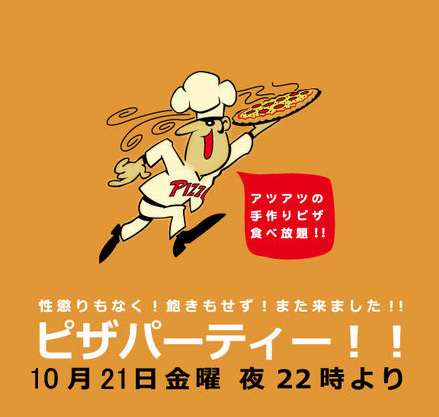 管理人様告知失礼します。 PIZZA PARTY 2011.10.21(金) 場所:金沢市片町マニール 時間:22:00〜朝まで 料金:1,000円(ピザ食べ放題) About PIZZA PARTY 金沢市片町マニールで2ヶ月に一度開催されるPIZZA PARTY! このPARTYはなんといっても格安な値段でPIZZAが食べ放題! マニールスタッフが作る熱々のPIZZAは最高にうまい! でかい具や種類の豊富さはPIZZA専門店に引きをとりません! そしてやはりメインはALL GENRE MUSIC!!! HOUSE,DRUM'N'BASS,REGGAE,HIP-HOP,DANCE MUSICを中心に各DJがフロア