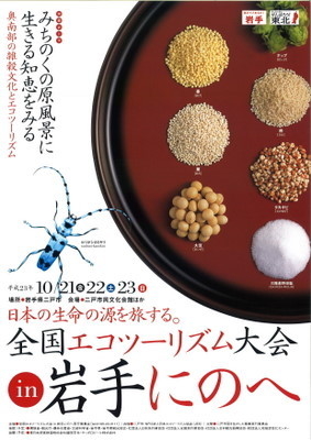 ■「全国エコツーリズム大会in岩手にのへ」開催■ 今年10月に、岩手県二戸市で「全国エコツーリズム大会」を開催します。 開催自体は昨年から決まっておりましたが、東日本大震災後に、二戸市の小保内市長より「岩手県民に希望と元気を与えるために必ず開催したい」とメッセージをいただきました。 二戸市では、本大会を皮切りに市内はもとより周辺地域、ひいては岩手県、東北全体へ元気を発信したいと切望しております。 二戸市は内陸寄りですが、震災後沿岸部の被災地への救援を行ってまいりました。 本大会では、沿岸部への応援ツアーも実