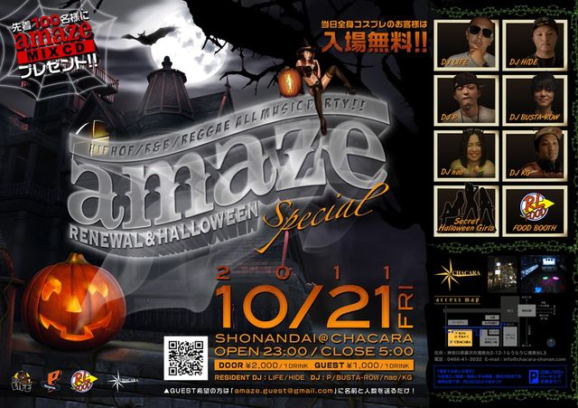 非常に急な話ですが、今回でamazeはFINALとなります! 今まで応援して来てくれた皆様、ならびにサポートしてくれた方々、本当にありがとうございました! 湘南台というCLUBとはかけ離れた土地でここまでやって来れたのも偏に皆様のおかげです! amazeは最後に一花咲かせます!! 最大収容人数500人の大イベントスペース"湘南台CHACARA"にて、毎年恒例のHALLOWEEN PARTYを開催!! 毎年大盛り上がりのamaze HALLOWEEN SPECIALは今年も最高の音、最高の雰囲気でお送りいたします★ HIPHOP,R&B,REGGAE好きな方はもちろん、とにか