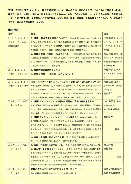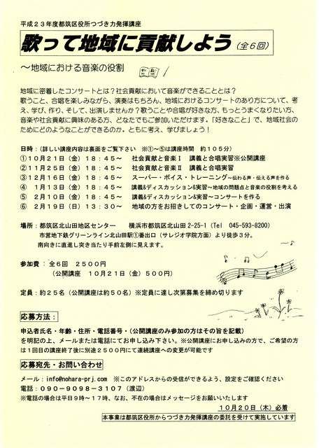 横浜市都筑区役所の委託を受けて、「のはらプロジェクト」http://mixi.jp/view_bbs.pl?id=65133354&comm_id=5630451主催の市民講座が始まります。プロアマ問わず、歌うことや音楽が好きな方、社会貢献に興味の有る方ならどなたでもご参加できます。歌の技術はもちろん、地域に密着したコンサートを企画し、出演します。ぜひ一緒に歌いましょう。皆様のご参加をお待ちしています。 ・・・音楽と社会貢献がどう結びつくのか??? 説明する言葉は数多くあれど、、、。 チャリティーや慰問だけではない、音楽のもっともっと大きな可能性が、ここにあ
