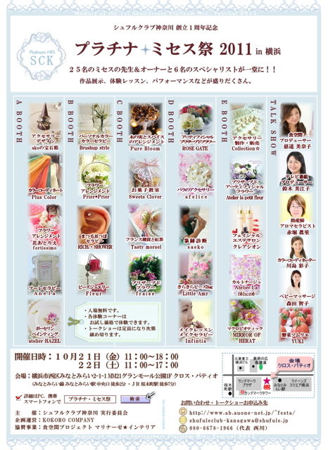 10月21、22日に開催される「プラチナミセス祭り2011」 にマリナーゼ★インテリアも 協賛出展いたします 代表 慈道美奈子(MIKOさん) のトークショー、レッスン&ワークショップ、 そしてテーブルアイテムの展示など、みなさまに楽しんでいただける企画が 盛りだくさんです 日時: 10月21(金) 11:00〜18:00、22日(土) 11:00〜17:00 場所: 横浜市西区みなとみらい2-1-1 MM21グランモール公園1F クロス・パティオ 入場: 無料 マリナーゼ★インテリア協力内容 代表 慈道美奈子によるトークショー