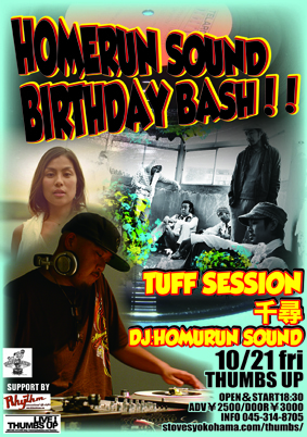 【HOMERUN SOUND BIRTHDAY BASH!!】 @横浜 Thumbs Up 横浜市西区南幸2-1-22 相鉄Movil3F Tel:045-314-8705 http://stovesyokohama.com/thumbs/ OPEN&START 18:30 ADV 2500yen DOOR 3000yen =LIVE= TUFF SESSION http://www.tuffsession.com/ 千尋with Shun Shun http://www.utautame.com/ =SELECTOR= HOMERUN SOUND http://homerunsound.blogspot.com/