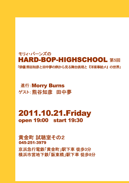 「モリィ・バーンズのHARD-BOP-HIGHSCHOOL 第5回」 2011 10.21(Fri)黄金町 試聴室その2 http://cafe.taf.co.jp/live/index.html 進行:Morry Burns ゲスト : 熊谷知彦, 田中夢 開場 19:00/開演 19:30 ※999Yen+order ●ミズノオト・シアターカンパニーによる演劇作品『洋楽事始メ』が黄金町バザール2011の連携プログラムとして現在上演されています。 演劇のことなどまるで何も知らないモリィ・バーンズが、おそらくは何かの間違えから『洋楽事始メ』の世界に踏み込むことになったその経緯と、演じることに対する現在の心境を語り
