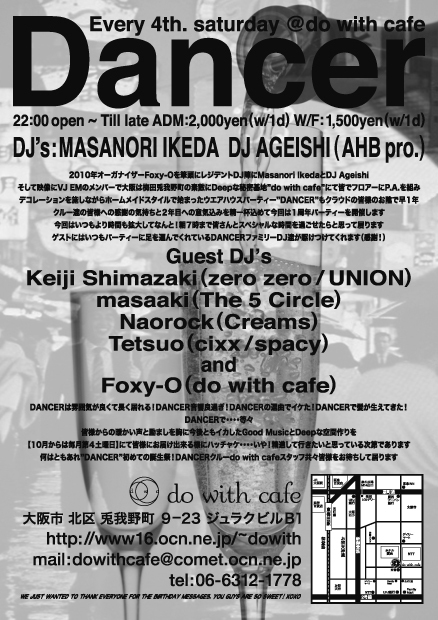管理人様 告知よろしくお願いいたします 今月から 第四土曜日に変更になります DANCER 1st anniversary 10.22 (Sat) @ OSAKA do with cafe 22:00 to 07:00 door 2000(w1d) w/f 1500(w1d) MASANORI IKEDA, AGEISHI, EM, KEIJI SHIMAZAKI(zerozero), Masaaki, NAOROCK, TETSUO, FOXY-O 2010年、オ―ガナイザーFoxy-Oを筆頭にレジデントDJ陣にMasanori Ikeda ,DJ Ageishi そして映像にVJ EMのメンバーで大阪は梅田兎我野町の素敵にDeepな秘密基地 ”do with cafe”にて皆でフロアーにP.Aを組み、 デコレーションを施しな