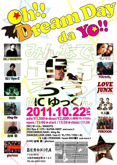 みんなで踊ろう↑↑ OH DREAM DAY [MC]ゆっくんfromプリンケツプリンケツω [DJ]Ryu-Z,STS,ALPHA-SHOT,…more!! [PERFORMER] NARI 超不思議!!! 目が釘づけまちがいない!!類を見ないその繊細なONLY-ONEパフォーマンスに注目!! LOVE JUNX 全国で大活躍する、ダンスパフォーマーグループ!! 栄養ドリンクからの♪明日への活力!!! Aleg-Re サッカーボールを見事に操る、世界一のフリース