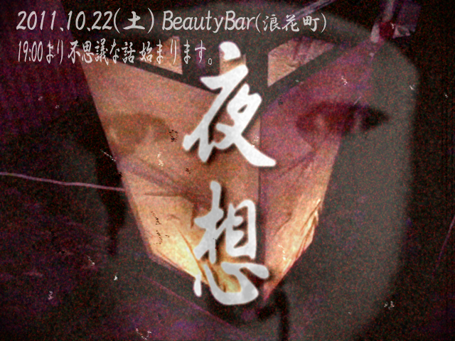 夜想 10/22(土)19:00〜不思議な話 @ビューティーバー(浪花町) ハロウイン&マヤ文明の終焉の1週間前 ビューティーバー(浪花町)にて私の体験や様々な方々から聞いた 不思議な話を聞いてもらいます。 3000円でちょっと贅沢なお食事をしながら話を聞いていただけます。 ぜひ、お越しくださいませ。 夜の部予約制 お電話下さい。または店頭、メッセージにて。 06−6375ー2048 http://www.youtube.com/watch?v=-XE-oj0Qppk