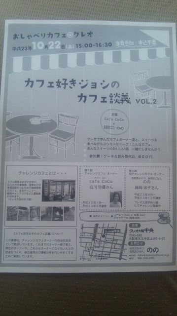 以前、急遽日程を延長した 『カフェ好きジョシのカフェ談議Vol2』 のお知らせです 今月10月22日土曜日 15時〜16時30分の開催と相成りました 当日参加で申し込みは不要ですが もし行く行く って方がいらっしゃいましたら、下記アドレスまで『カフェ好きジョシ』の件名を添えてご一報いただけると、当日かなりスムーズなご案内になるかと思います ケーキと飲み物代だけ800円ちょうだいする形になります 談議の内容としましては… ・関西のカフェ情報交換 ・こんなカフェが好き ・