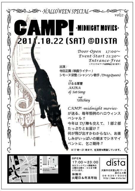 管理人様告知失礼致します。 CAMP! -midnight moives- Vol.52 『HALLOWEEN SPECIAL』 CAMP! -midmight movies- が送る、毎年恒例のハロウィンスペシャル!! 今年はDJ陣も交え、1部2部たっぷりとお届け!! 何が飛び出すかわからない、お楽しみがいっぱいの朝までシネマイベントに、乞ご期待!! ■開催日時 2011/10/22 (Sat) Door-Open 17:00〜 Event-Start 21:30〜 以降翌朝5時までカフェオープン 【17:00〜21:00までは虹茶房を開催】 http://www.dista.be/events/?event_id=27539 ■入場料:無料(ドリン