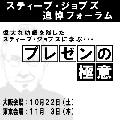 管理人様、書き込みを失礼致します。 スティーブジョブズ氏の急逝を偲び、NPO法人国際プレゼンテーション協会では、 彼の偉業とすばらしいプレゼンをテーマとし、イベントを行うこととなりました。 東京、大阪近隣の皆様、ご参加されませんか? フォーラムの詳細−−−−−−−−−−−−−−−−−−−−−−−−−−−−−−−−−−−−−− 2011年10月6日、スティーブ・ジョブズの訃報が世界に発信されました。 そこで、当協会では彼の偉大な功績をたたえ「スティーブ・ジョブズ追悼フォーラム」を開催します。 フォーラ